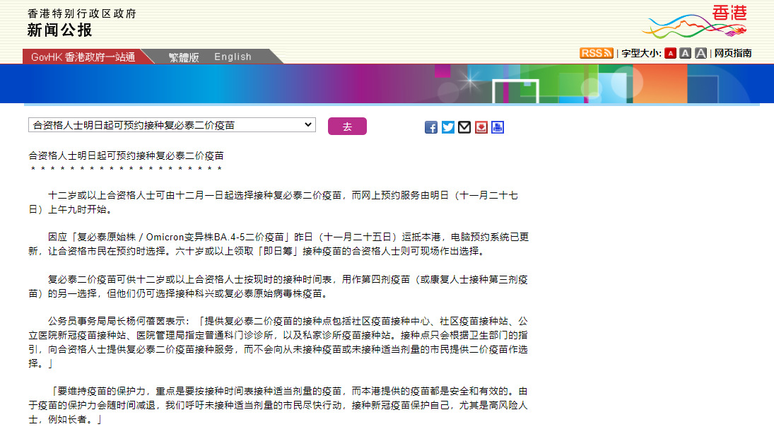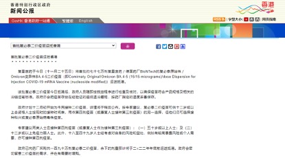 復星醫藥方面表示,復必泰二價疫苗可供12歲或以上人士作第四劑加強針選擇,康復人士可用作第三劑疫苗接種。根據香港特區政府官方又一信息稱,香港市民可于11月27日起可預約接種,12月1日正式開打復必泰二價疫苗。
